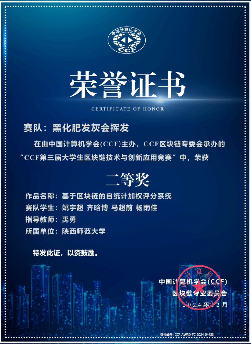 近日,中国计算机学会公布了“第三届CCF区块链技术与创新应用竞赛”决赛成绩。本次竞赛吸引了来自全国各大高校和企业的260支团队参与,经过激烈角逐,由公司禹勇教授指导,姚宇超、齐晗博、马超前、杨雨佳组成的团队,凭借其创新作品“基于区块链的自统计加权评分系统”成功晋级决赛。在决赛的现场答辩、作品展示及专家评审环节中,团队成员凭借扎实的专业知识、创新的技术方案以及出色的团队协作能力,赢得了评委的一致好评,最终荣获二等奖,禹勇教授被评为优秀指导教师。