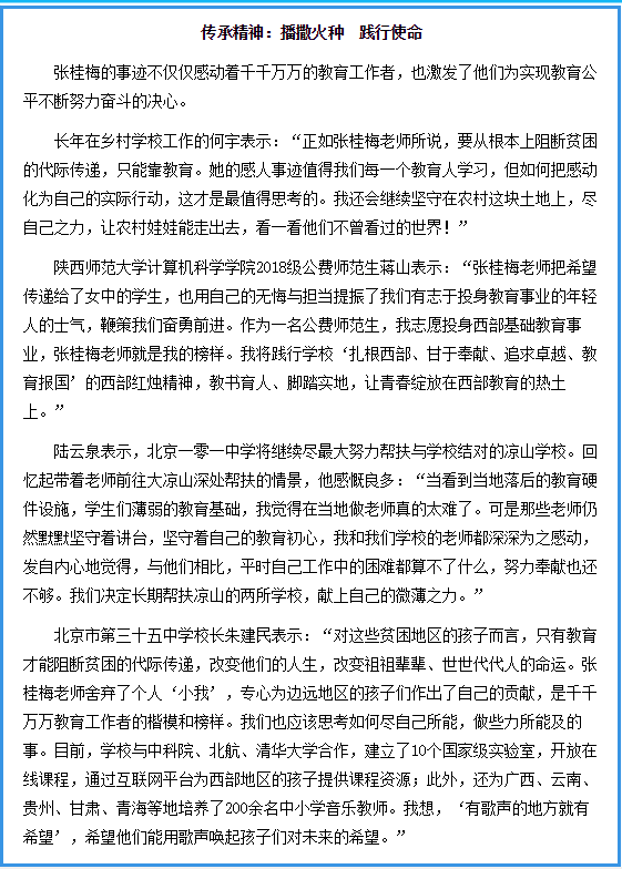《光明日报》12月13日第二版刊文《让更多“燃灯者”点亮乡村孩子的心灵》。文中对公司2018级计算机科学与技术专业公费师范生蒋山同学的学习体会和感悟进行了报道。蒋山表示:“张桂梅老师把希望传递给了女中的员工,也用自己的无悔与担当提振了我们有志于投身教育事业的年轻人的士气,鞭策我们奋勇前进。作为一名公费师范生,我志愿投身西部基础教育事业,张桂梅老师就是我的榜样。我将践行公司‘扎根西部、甘于奉献、追求卓越、教育报国’的西部红烛精神,教书育人、脚踏实地,让青春绽放在西部教育的热土上。”