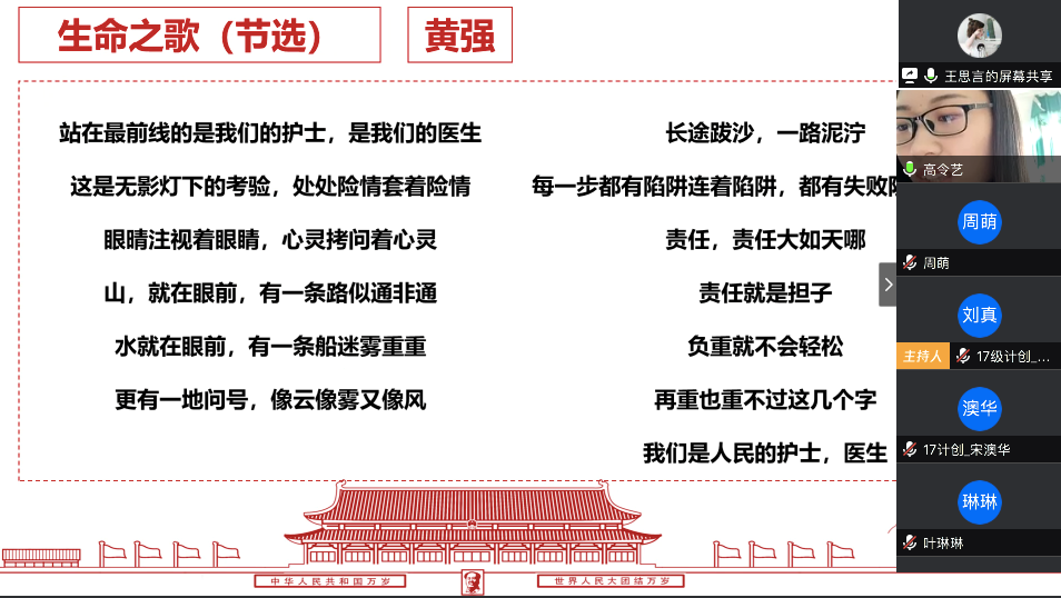 随后,高令艺、张雅楠和王越等同志依次带来诗歌朗诵《生命之歌》、《清明谣》和《五星红旗上的土壤》,寄托对英雄的无尽哀思,迎候生命的生生不息。
