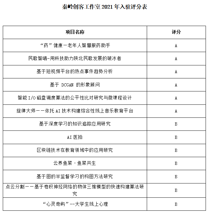 公司于6月23日组织了2021年度秦岭创客工作室入驻项目遴选推荐工作。通过项目组申报答辩、院内专家评审等程序,共遴选出13个项目入驻创客工作室,A类项目6项(入驻文津楼3624),B类项目7项(入驻文津楼4楼创客坊),现将拟推荐项目名单予以公示(详见附表)。推荐项目将于7月5日起入驻秦岭创客工作室,并按照《秦岭创客工作室》入驻指南进行项目培育。