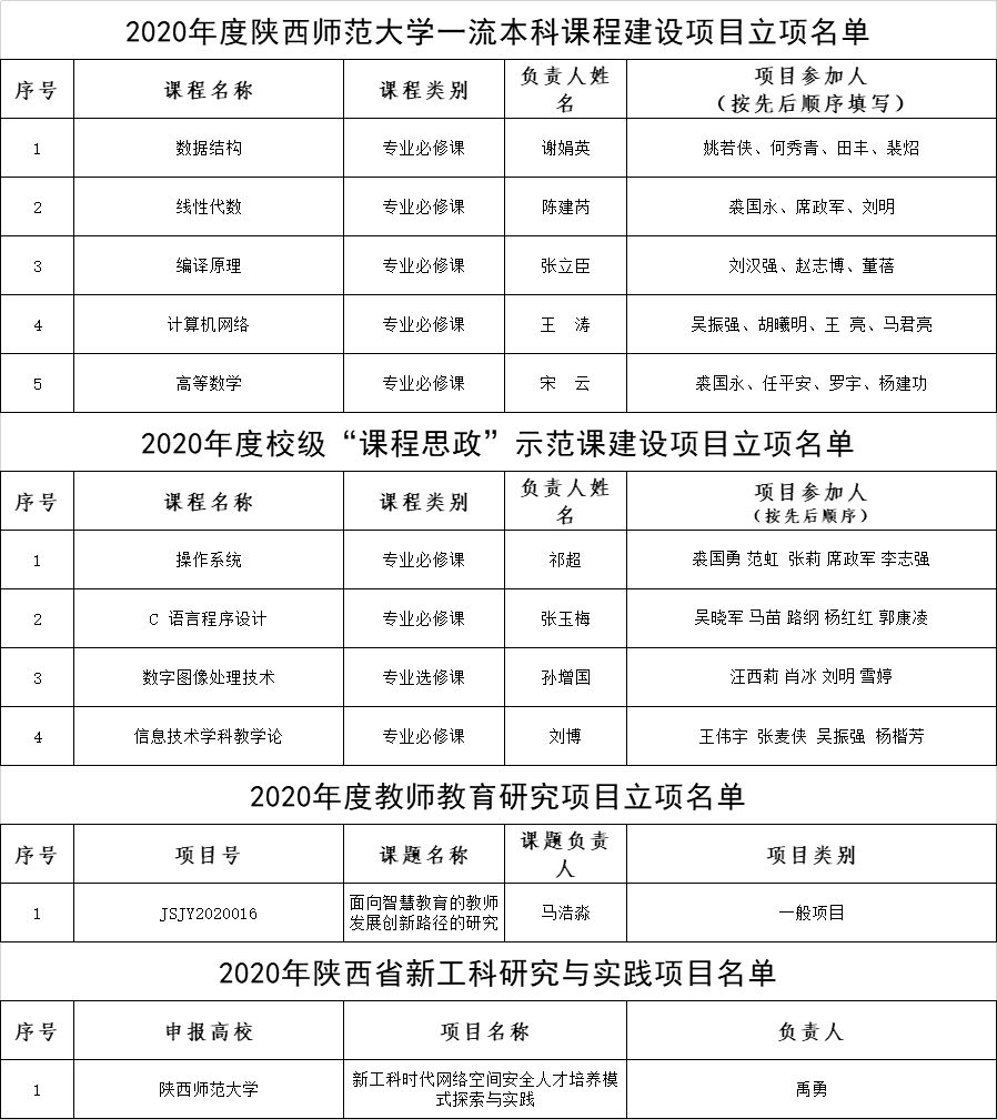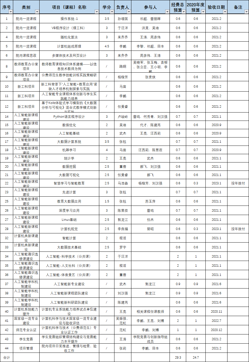 为了切实提高本科教学质量,7月13日经公司党政联席会议研究决定,对今年提交了相关申请未受公司及以上资助的项目和人工智能专业的新课程建设项目以及其他类项目开展院内资助与建设,拟立项清单如下表所示。请相关负责人和参研人员明确建设目标,签订任课责任书,扎实开展教研,按时提交中期报告(2020年秋季学期末)和结题报告(日期见详表),保质保量完成预定任务目标。