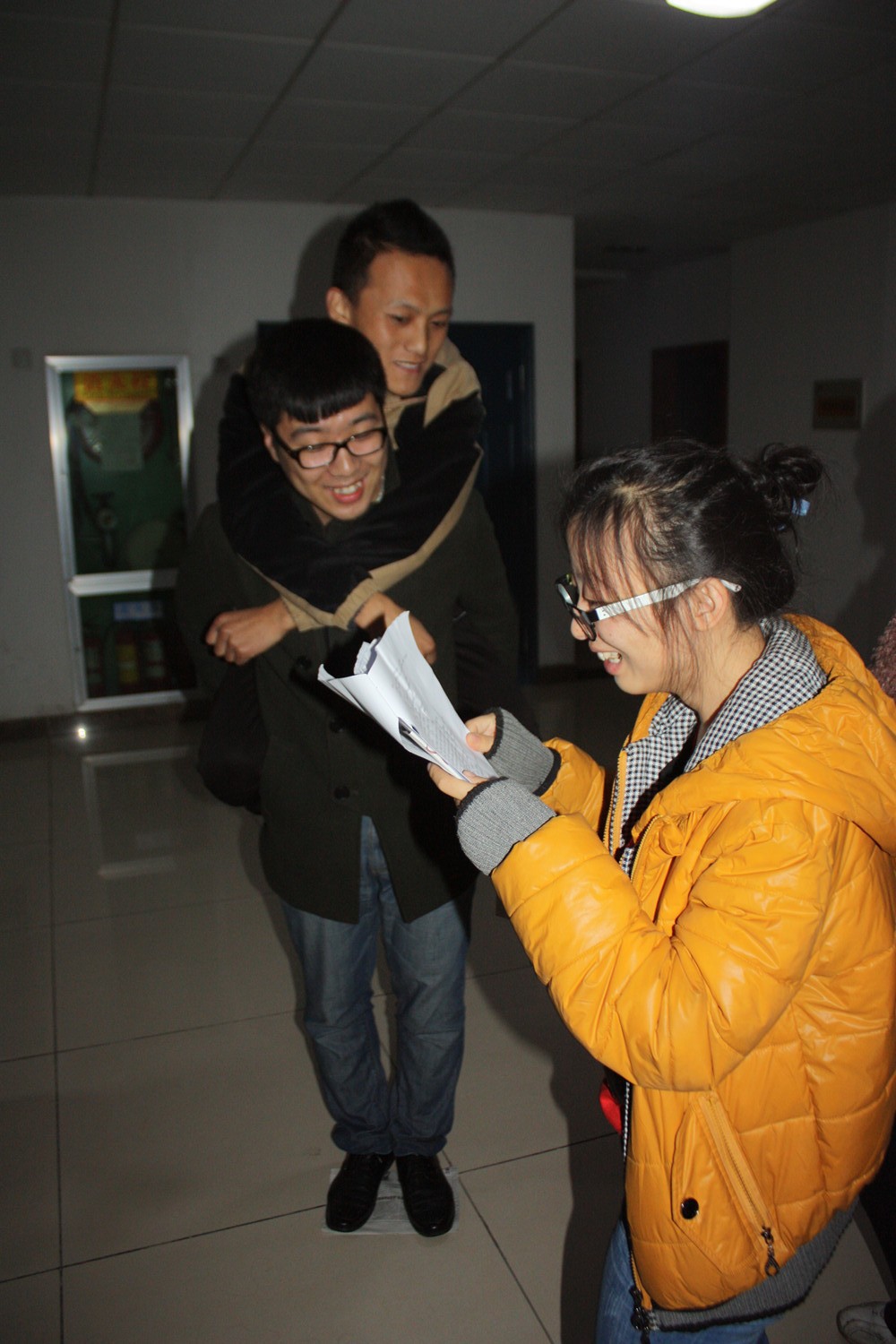 其次进行的是俩人团体项目,考验两个人的团队协作能力。2个人要站在同一张报纸上,回答错误报纸对折,而回答正确的队伍可以要求其他队的报纸对折。同学们在活动中既增长了知识,也在接受惩罚的时候逐渐相互信任、想办法一起站在越来越小的报纸上。